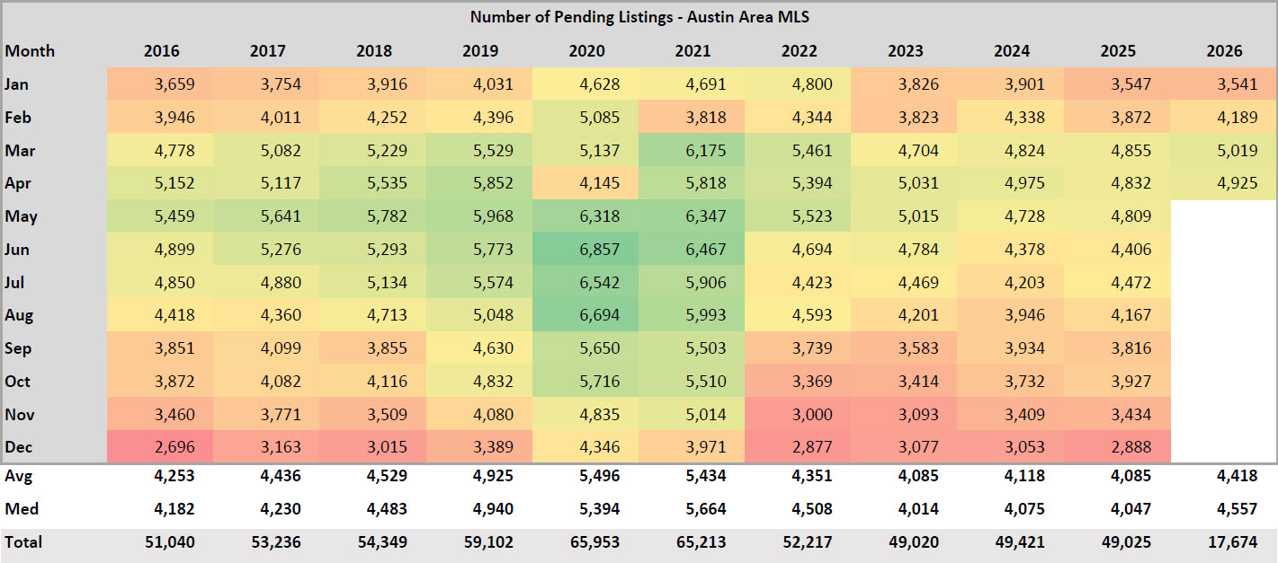 Pending listings are one of the most forward-looking indicators available in any austin market update, because they represent buyers who have already made a decision to purchase. As of April 9, 2026, there are 4,826 pending listings across the Austin MLS, which is 2.9% above the same point in April 2025. More importantly, March 2026 was the first month since May 2023 to see pending listings cross the 5,000 mark, reaching 5,019. That milestone signals a meaningful uptick in buyer engagement after nearly three years of subdued contract activity. When pending counts rise year over year while inventory also rises, it typically means the market is absorbing supply at a faster pace even as more homes come to market, which is the early pattern of a recovery. It is too soon to call a full recovery, but the pending trend is the data point most worth watching in the weeks ahead.
